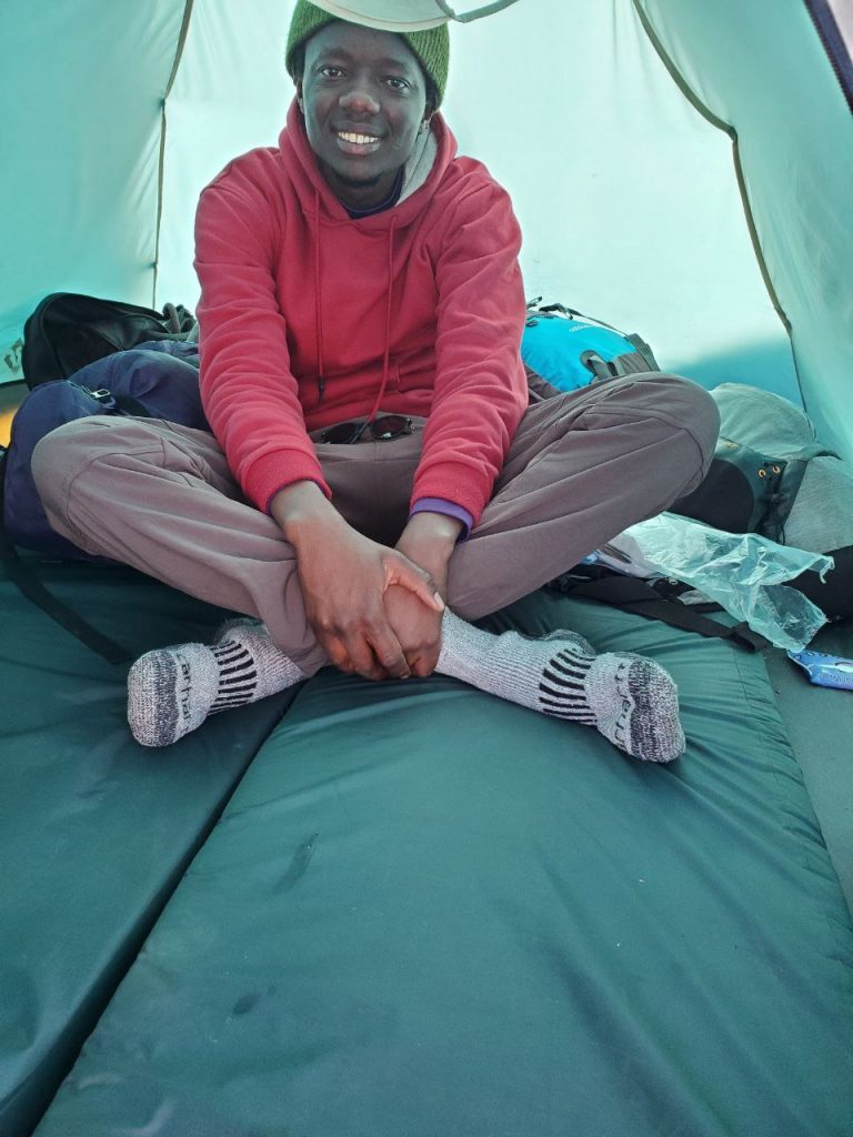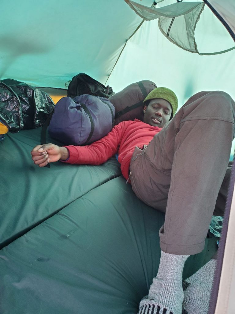 I could handle all this. What I could not, was sleeping inside the tiny tents, or worse sharing it with Sleeping bag. We are both tall dudes, and if you understand our anatomies the height is proportionally and consistently spread out in our bodies. I couldn’t go full stretch, and so it meant sleeping with knees bend over the other, vertically! Eye contacts, touching even accidental, sexy or nice voices…all these we agreed with Sleeping Bag were contraventional. The girls I suspect were cuddling their way through the night. For us, the Unspoken Bros constitution was in play. In both camps, Lake Elis and our Summit camp Club Mackinders this was upheld. Our potter’s bags and day packs came in handy in demarcating boundaries in our tiny tent. Did we even sleep?